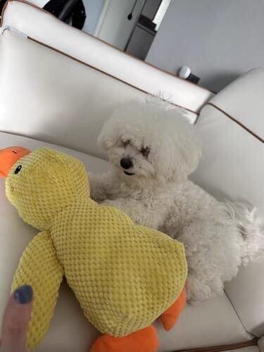 The duck companion is made of soft plush and is machine washable. Suitable for dogs of all sizes and breeds, it's perfect for tugging, chewing, and pulling. Dogs love to cuddle with it and even fall asleep with their duck friend.